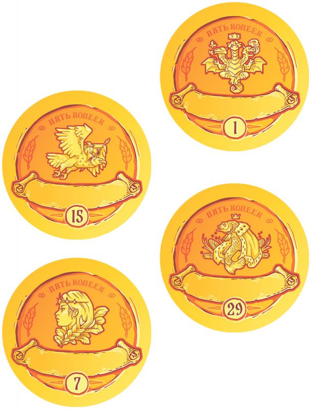Карточных колод в игре нет; основной компонент – пронумерованные монеты.​