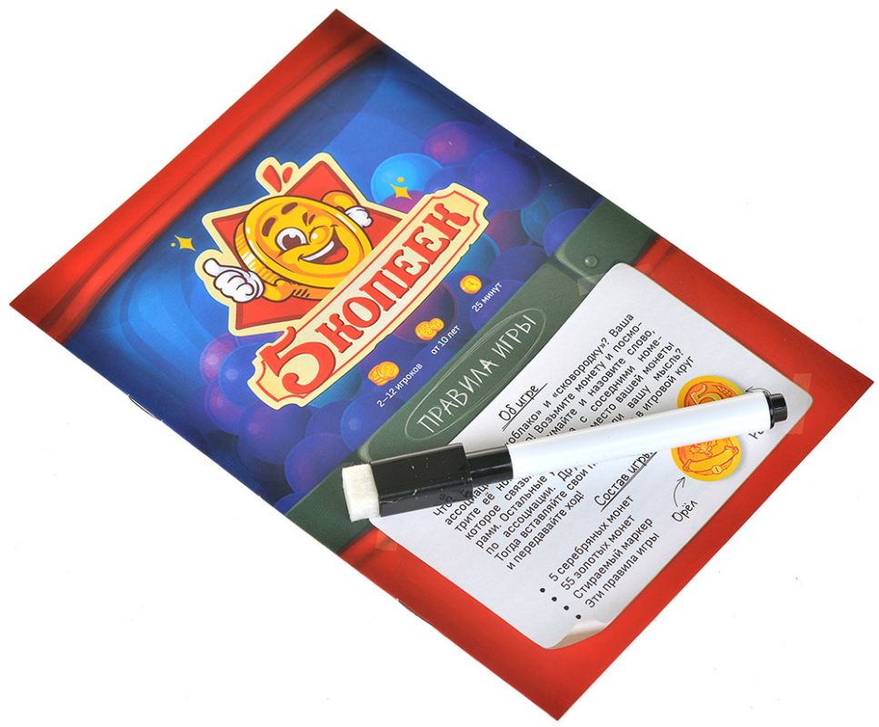 «5 копеек» – лёгкая ассоциативная игра для дружной компании, в которой одна маленькая монета запускает цепную реакцию из подсказок и догадок. Игроки по очереди тайно выбирают число на общем поле, придумывают к нему ассоциации и пытаются сделать так, чтобы другие смогли найти их монету, но не слишком легко. За столом постоянно звучат смех, спорные версии и комментарии в стиле «ну как ты мог это придумать?», а каждая новая подсказка заставляет смотреть на привычные слова под другим углом.
