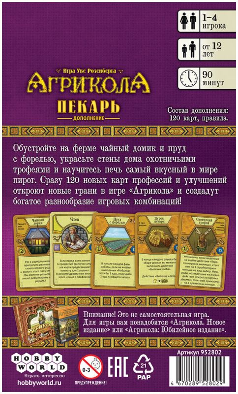 «Агрикола: Пекарь» рассчитана на возраст от 12 лет и сохраняет рекомендуемую продолжительность партии около 90 минут, как и базовая игра. Дополнение органично встраивается в коробку базовой Агриколы: карты стандартного формата удобно смешивать с основными колодами и сортировать по желанию игроков. Вы можете использовать только часть новых карт для постепенного усложнения игры или сразу добавить полный набор, чтобы получить плотный, тактически насыщенный опыт для опытной компании.