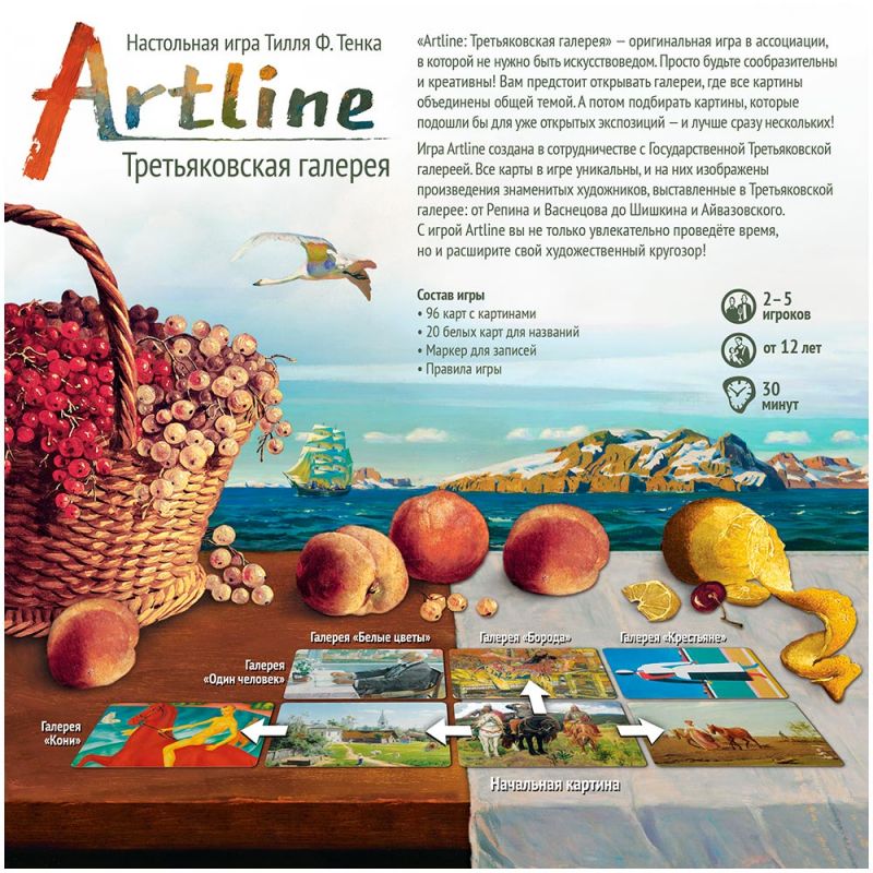 Artline: «Третьяковская галерея» – ассоциативная настольная игра, в которой ваши подсказки и тематика выставок строятся вокруг реальных полотен из коллекции Государственной Третьяковской галереи. Здесь не нужно быть искусствоведом: достаточно внимательности, наблюдательности и немного фантазии. Вы будете открывать «галереи» – ряды картин, объединённых общей темой, и подбирать к ним новые картины так, чтобы они подходили сразу к нескольким темам одновременно.
