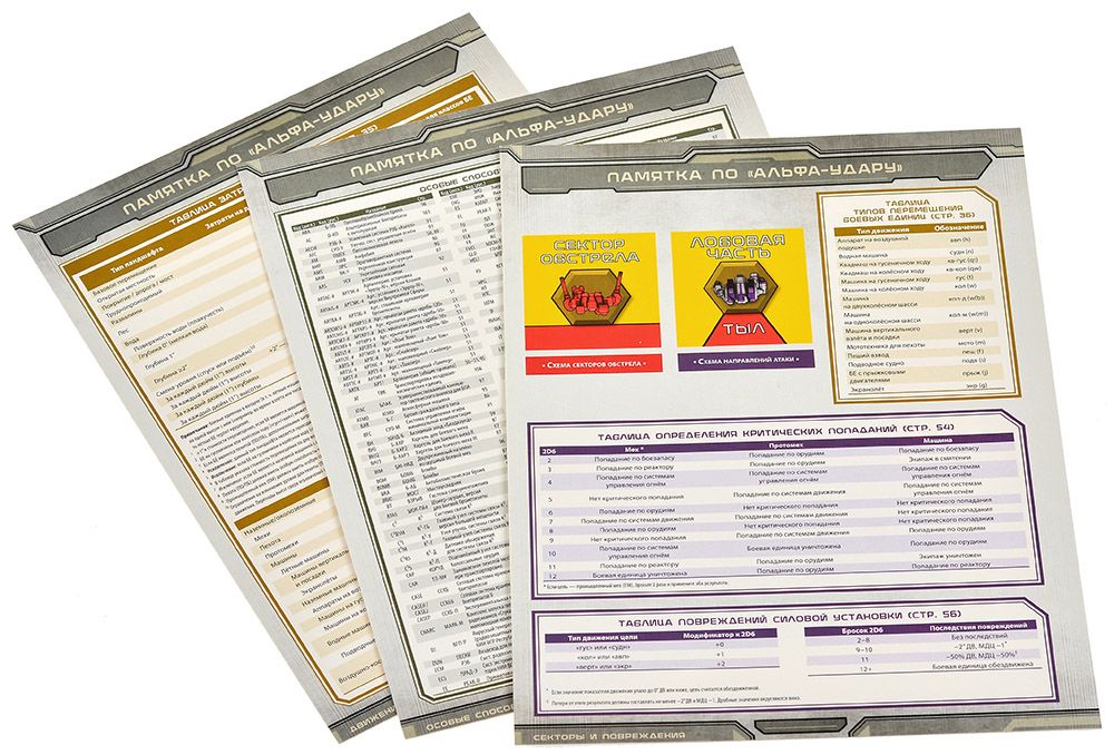Три плотных двухсторонних листа с памятками по часто используемым правилам — ещё один практичный компонент. На них выведены ключевые таблицы и подсказки по режиму «Альфа-удар», которые обычно приходится искать в книге командира. Благодаря таким памяткам игроки реже отвлекаются на перелистывание страниц и быстрее принимают решения во время хода. Это особенно ощущается в партиях с несколькими участниками: меньше пауз — больше динамики боя и тактических решений.