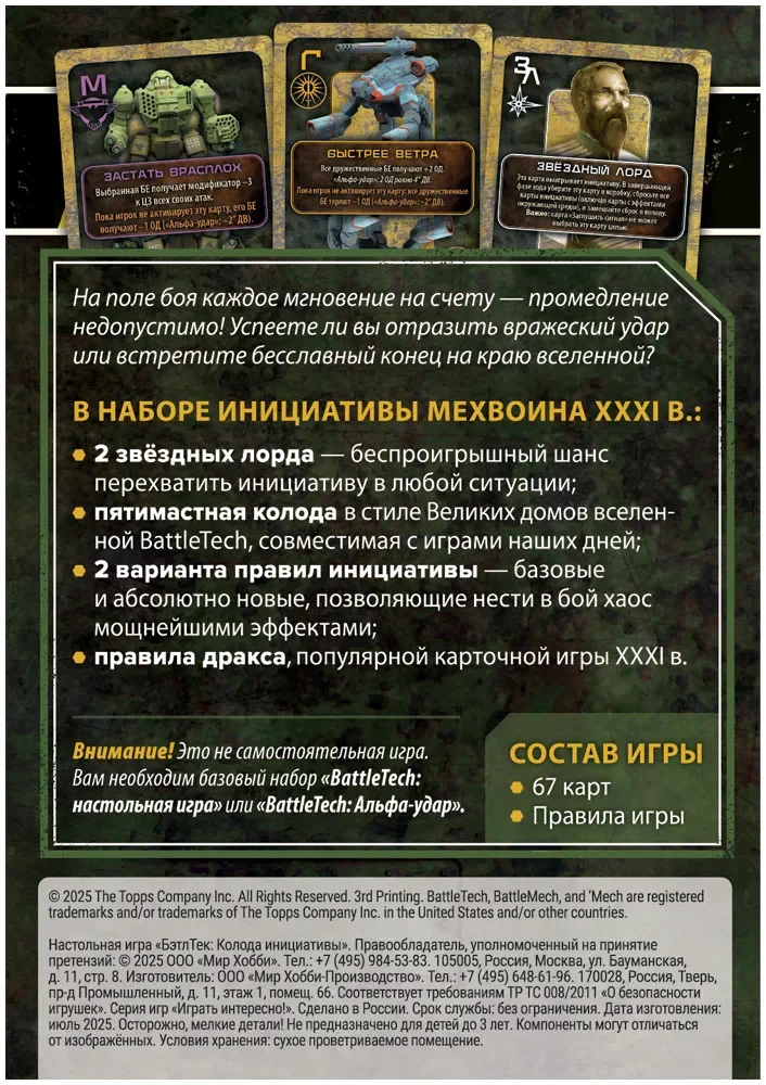 Обратите внимание: это не самостоятельная игра. Для использования колоды требуются базовые правила «BattleTech: Настольная игра» или «BattleTech: Альфа‑удар. Основная книга командира».