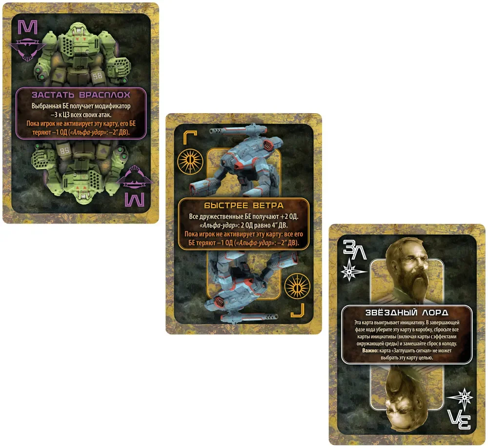 Колода предлагает два варианта использования. В первом случае она просто заменяет броски кубиков: карты используются для определения инициативы, но общая структура хода остаётся прежней. Во втором режиме активируются особые эффекты, делающие каждый ход менее предсказуемым: некоторые карты позволяют резко изменять порядок активации отрядов, навязывать противнику невыгодные решения или давать временные преимущества вашим мехам. Такой подход подойдёт компаниям, которым хочется добавить в привычные сражения больше драматизма и неожиданных поворотов.