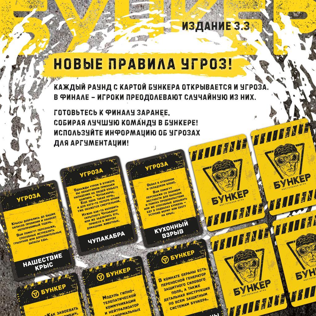 Особенность издания «Бункер» 3.3 – это обновлённые, иллюстрированные колоды и актуальные карты. В этой версии присутствуют уникальные иллюстрации на всех картах «Багаж», «Хобби», «Факты» и «Здоровье», что делает набор персонажей более наглядным и атмосферным. В комплект также входит карта «Кода доступа», а часть карт была переработана по сравнению с предыдущими версиями, что освежает партии и добавляет вариативности.
