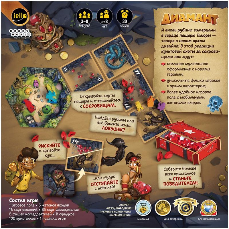 Новое издание «Диаманта» оформлено в ярком мультяшном стиле с узнаваемыми персонажами‑исследователями и улучшенным игровым полем. У каждого игрока есть уникальная фишка исследователя с собственным характером, а входы в пещеру представлены отдельными жетонами, которые удобно перемещать по полю. Такое оформление делает игру более наглядной и привлекательной для детей и взрослых, а простые правила позволяют объяснить её за пару минут.