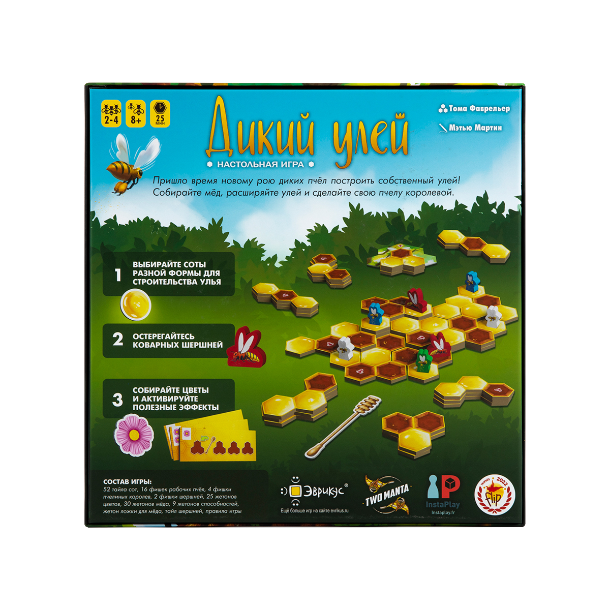 «Дикий улей» – семейная стратегическая настольная игра, в которой игроки становятся частью дикого роя, строящего новый общий улей. На столе постепенно вырастает мозаика из шестиугольных сот, а ваша задача – занять в ней самые выгодные места своими рабочими пчёлами, собрать как можно больше мёда и вовремя посадить на трон собственную королеву. При этом расслабляться не получится: по сотам бродят шершни, и неправильный ход может превратить хорошо подготовленную позицию в рискованную.