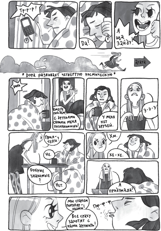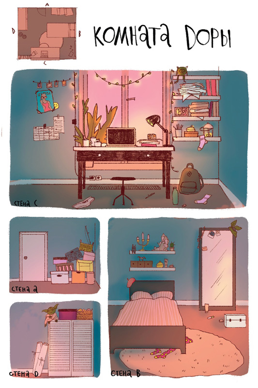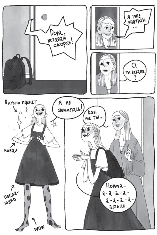 Три главы этого комикса рассказывают о событиях осени, зимы и весны из жизни девятиклассницы Доры, которая только что сменила школу. Дора страдает от всего, от чего страдает каждый подросток. Её частенько заносит на поворотах, но он старается, учится задумываться о последствиях своих действий, преодолевать трудности и ценить настоящую дружбу. Эта книга является дебютной работой иллюстратора Ани Смирновой, также известной как Anya Conservi, и затрагивает темы, не так часто встречающиеся на страницах отечественных комиксов.