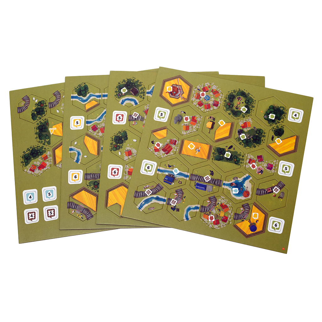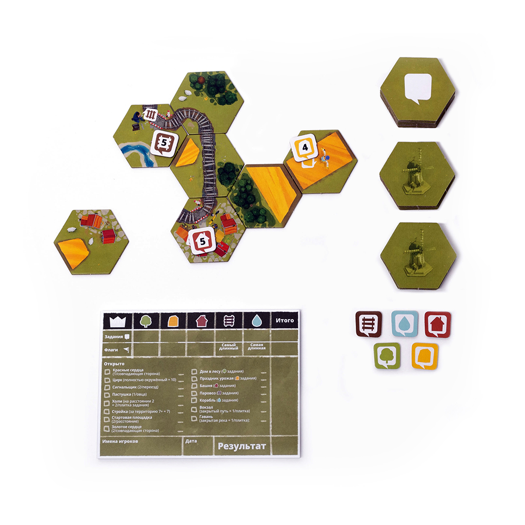 Игроки сообща создают уютную деревню, выкладывая шестиугольные тайлы: