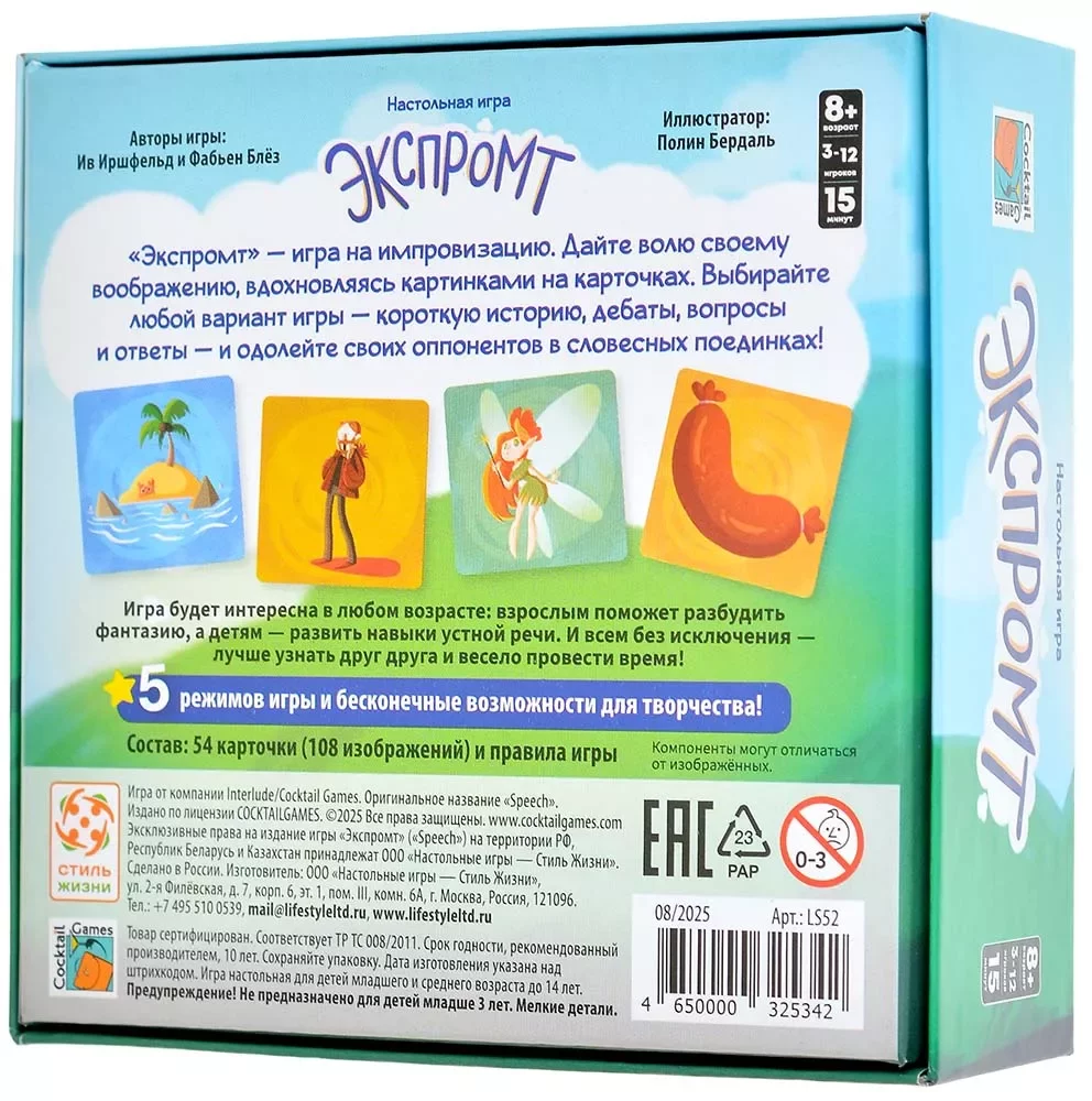 Компактная квадратная коробка и всего одна колода карт делают игру мобильной – её удобно брать с собой в поездку, на дачу или в гости. А универсальный формат без сложных компонентов позволяет разложить «Экспромт» практически где угодно: нужна только поверхность для карт и немного воображения.