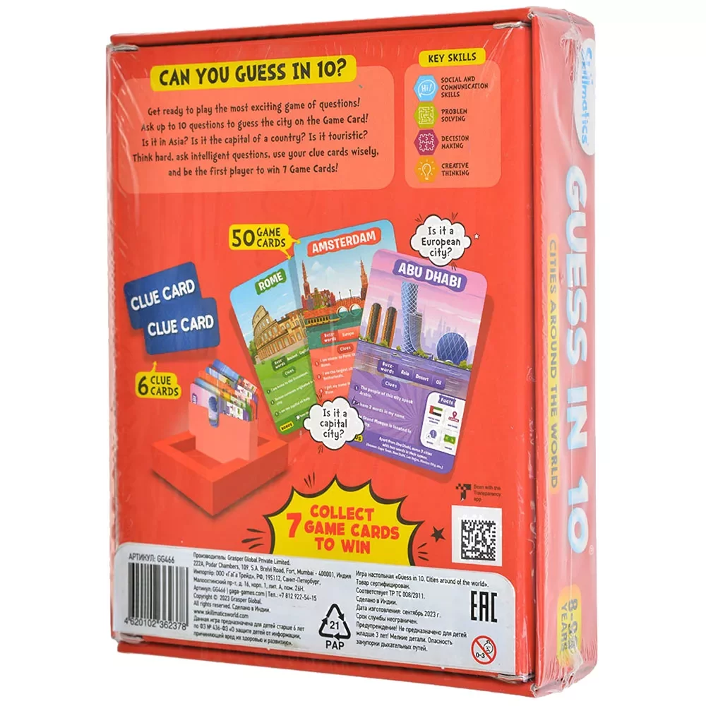 Guess in 10: Cities Around the World рассчитана на 2–6 игроков, что делает её удобной как для семейных вечеров, так и для занятий в группе или на кружке. Средняя партия занимает около 15–20 минут, поэтому игру легко использовать как «разминку» на уроке или провести несколько раундов подряд. Компактная коробка и отсутствие лишних компонентов (только карты и подсказки) позволяют брать игру с собой в дорогу, на дачу или в гости — достаточно небольшого свободного места на столе.​