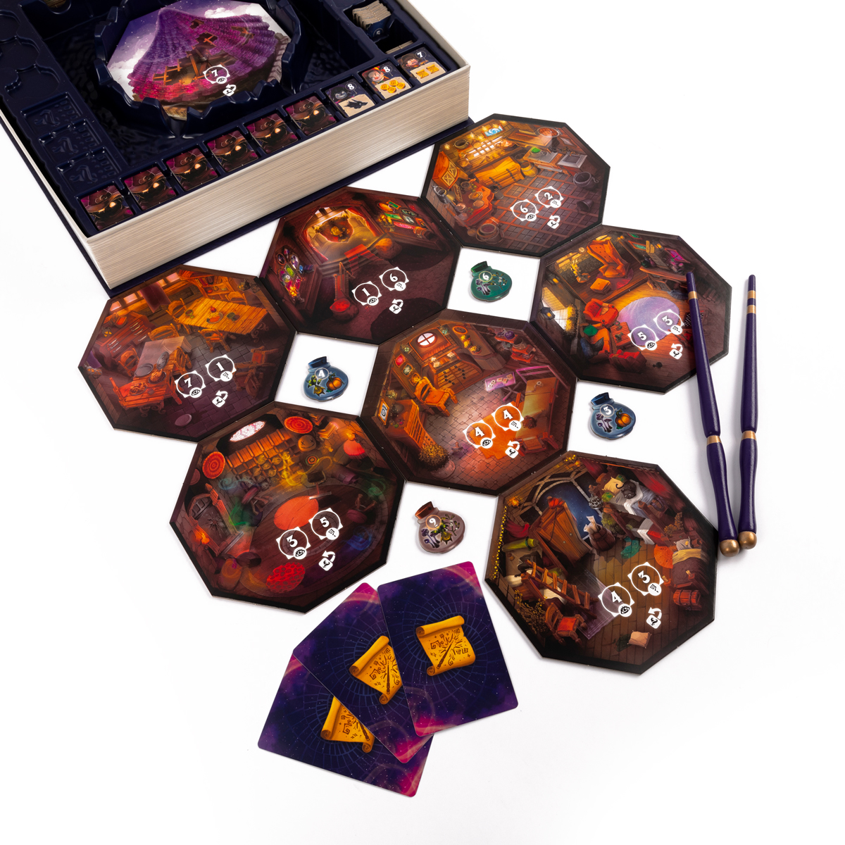 Башня состоит из нескольких комнат‑этажей, представленных тайлами. Количество комнат зависит от числа игроков: чем вас больше, тем длиннее путешествие по башне и тем разнообразнее партии. В начале раунда открывается очередная комната – на специальной подставке размещают тайл, а вокруг выкладывают набор видимых и тайных жетонов: артефакты, ингредиенты, монстров, книги магии, особые жетоны и многое другое.