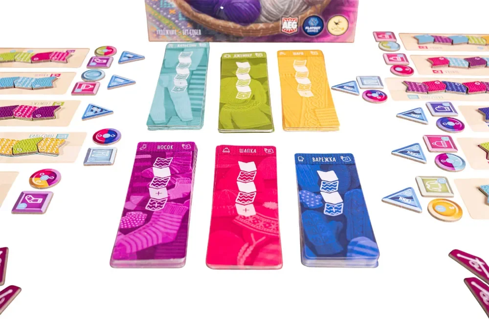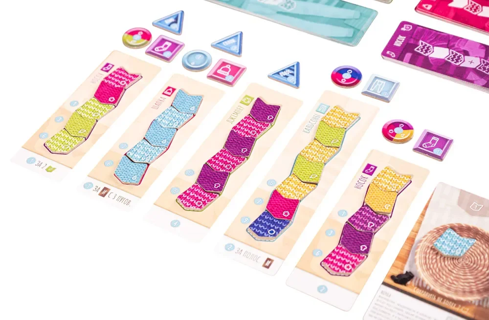 • Фишки котиков, спицы, центральные и личные планшеты формируют общую зону сбора пряжи и личные игровые поля.