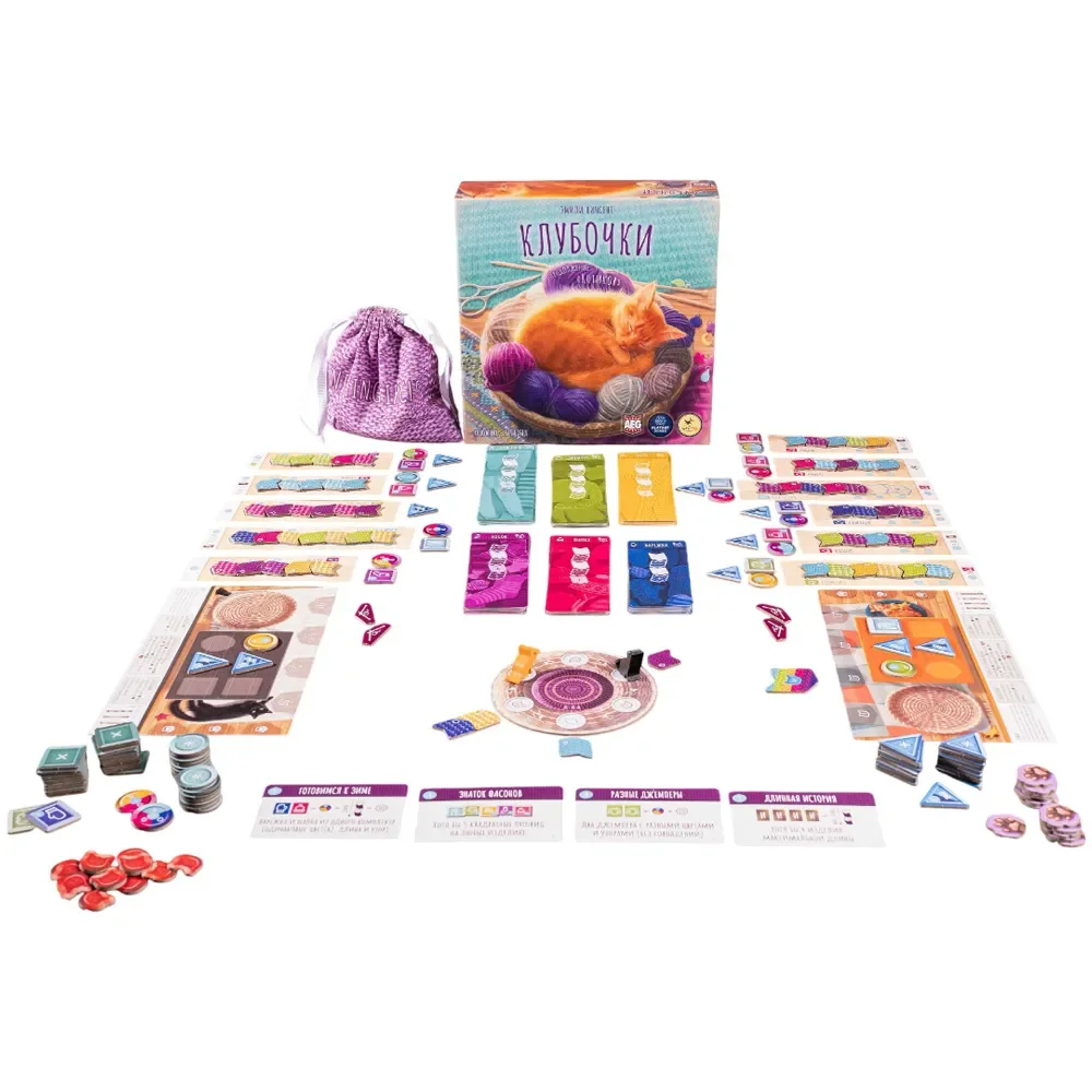 В «Клубочках» комната наполняется запахом шерсти и дерева, солнечные блики играют на спицах и пуговицах, а где‑то под диваном довольно мурлычет кот, охраняющий свои клубки. Игроки становятся вязальщиками и за несколько раундов пытаются создать самые красивые и выгодные вязаные изделия, сочетая цвета пряжи, типы глади и аккуратно пришитые пуговицы. Это семейная настольная игра с тёплой атмосферой рукоделия, в которой аккуратное планирование сочетается с очень милыми компонентами и котиками‑помощниками.​
