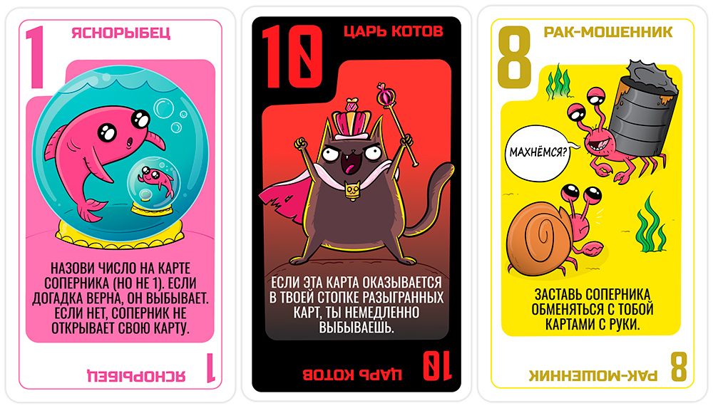 Когда колода заканчивается, игроки открывают свои карты. Владелец самой старшей карты получает победный жетон. Первый, кто соберет 2 или 3 жетона (в зависимости от количества игроков), объявляется победителем!