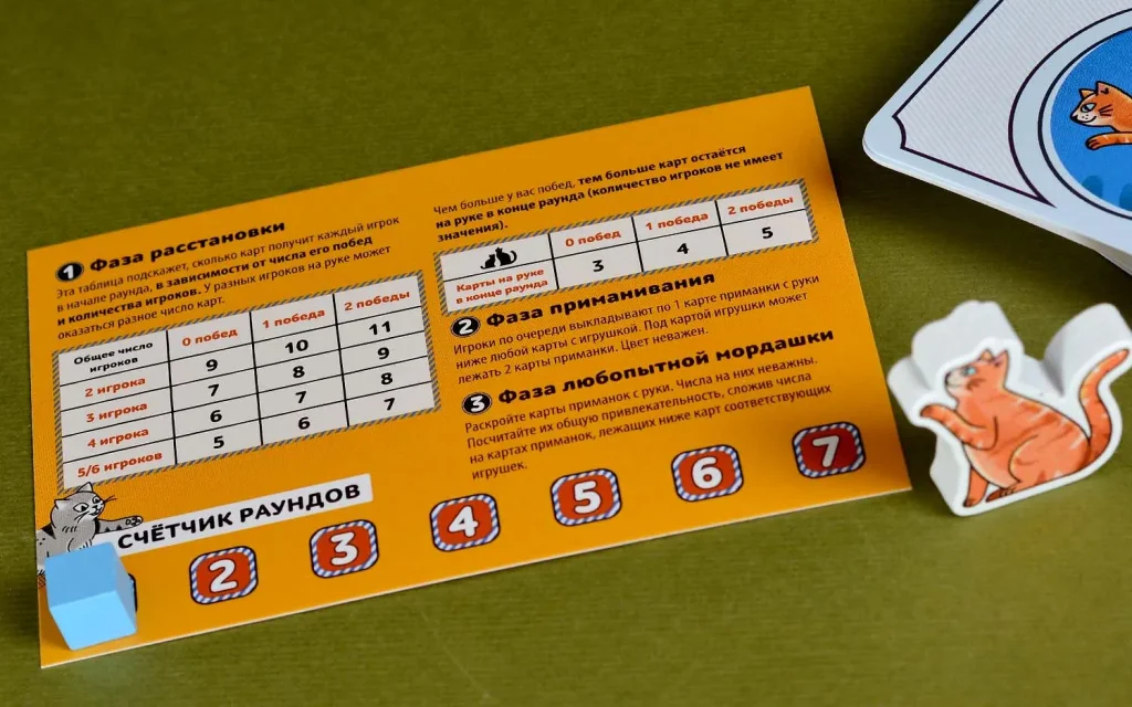 Раунд делится на три понятные фазы. В фазе расстановки определяется цель: положение кота на шкале интереса и количество карт приманок, которое получит каждый игрок в этом раунде. Здесь уже чувствуется накопительный эффект: успехи в прошлых раундах влияют на стартовые возможности, поэтому лидеру будет чуть сложнее, а отстающим – проще вернуться в игру.​