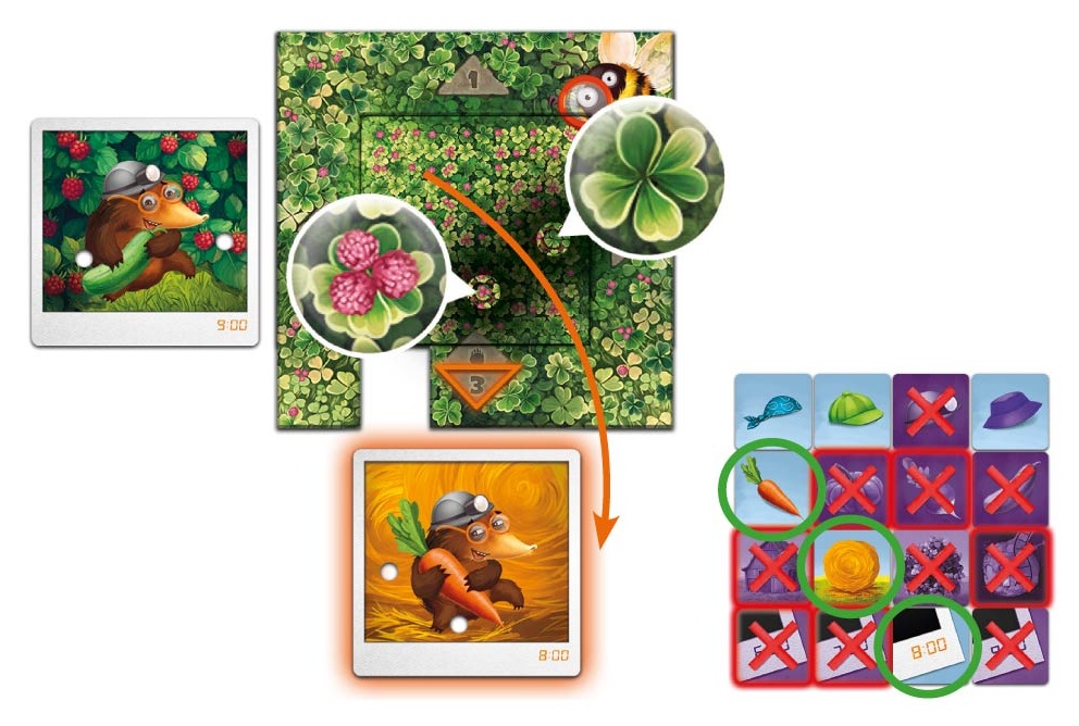 В свой ход садовод берёт карту подозреваемого и кладёт её на планшет, совмещая ориентацию. Через окошко шмель показывает 0–3 цветка — число совпадений с секретной картой. Команда обсуждает: «Два цветка значит, совпадает крот и время, но не овощ!». Если обстоятельство точно неверно, переверните жетон лицом вниз. Добирайте карты из колоды, пока не сузите круг до уверенности.