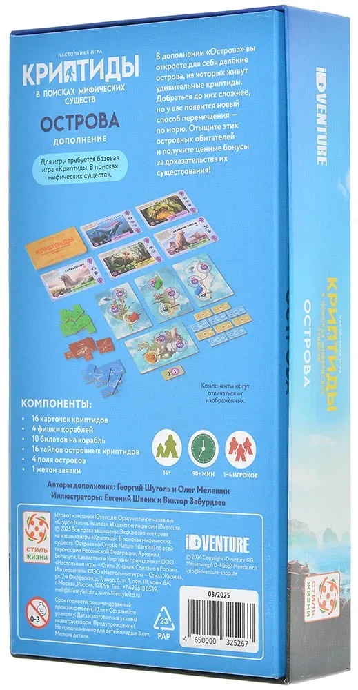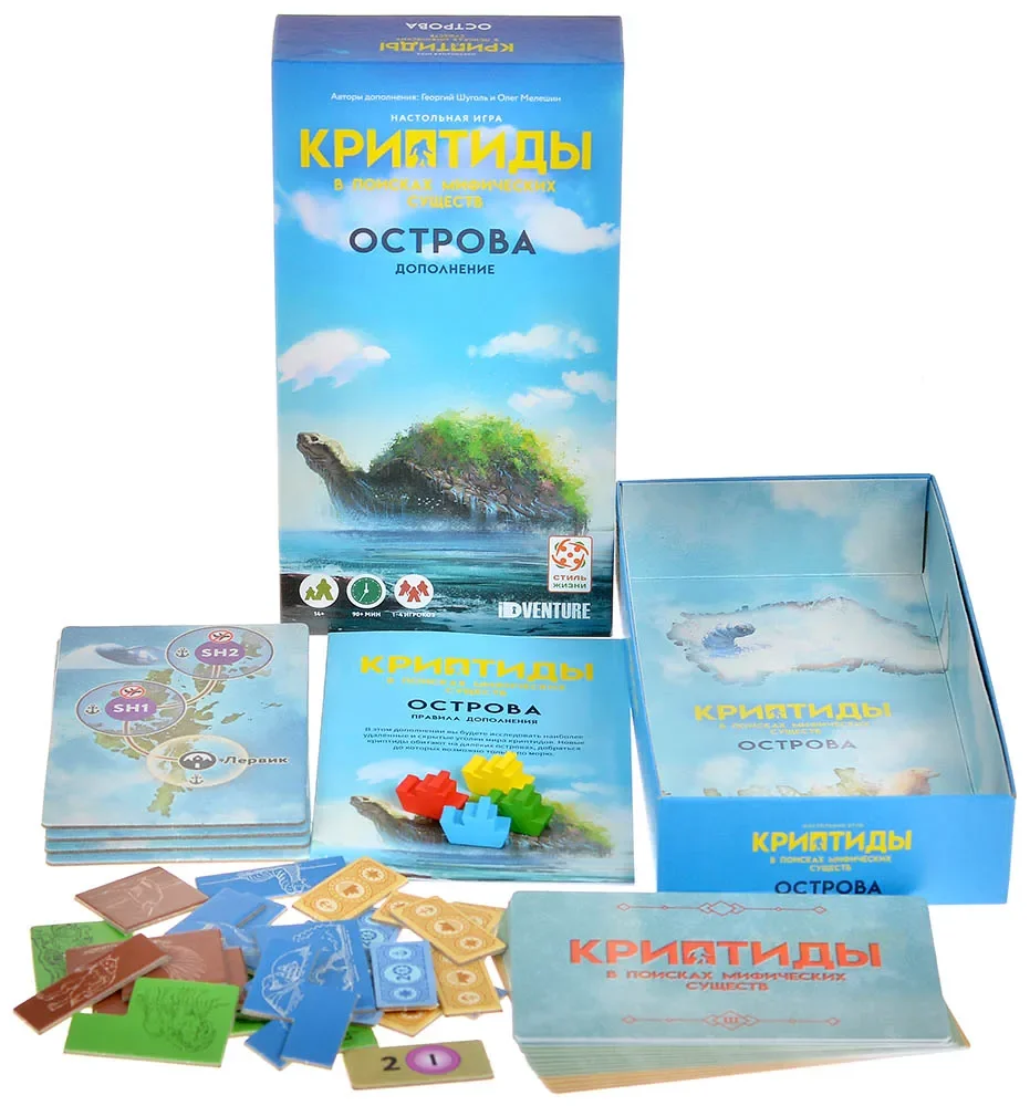 Важно: на странице прямо сказано, что продукт не является самостоятельным. Для использования дополнения нужна базовая версия «Криптиды: В поисках мифических существ», именно она содержит все базовые компоненты – игровое поле Европы, заповедник, основные карты криптидов и контрактов, жетоны ресурсов, фигурки криптозоологов и помощников. «Острова» привносят дополнительные карты, тайлы и фишки, которые встроены в уже существующую систему, а не заменяют её.