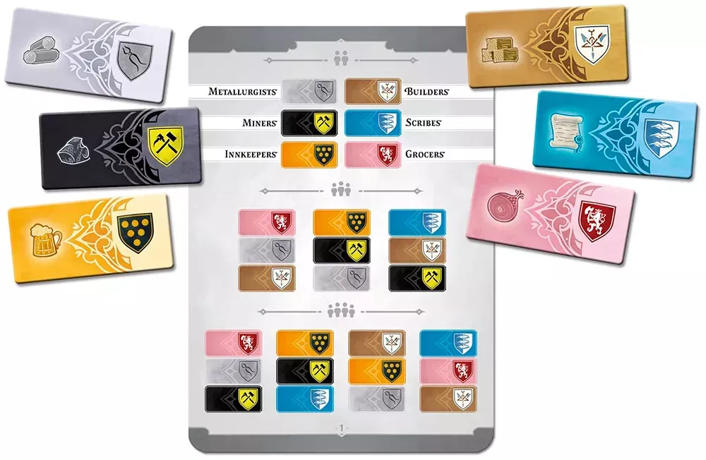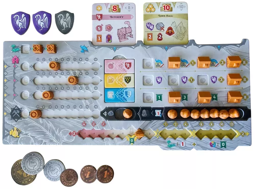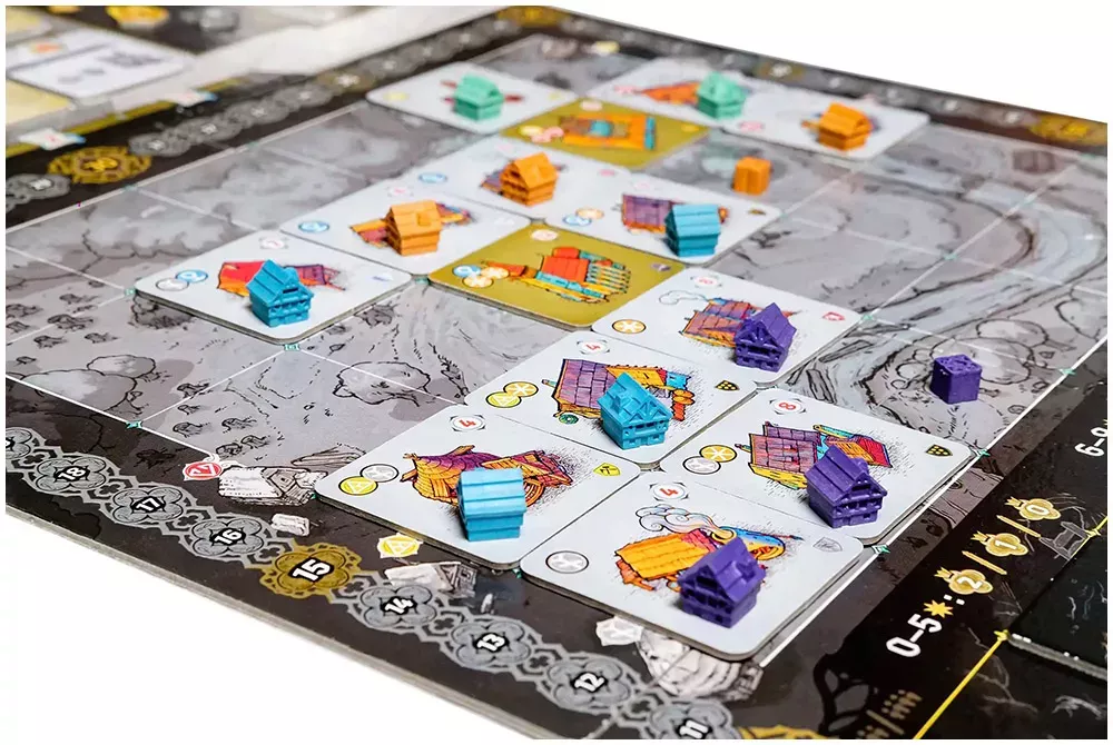 Каждый игрок связан с набором гильдий – асимметричных направлений, вроде горной, ремесленной и строительной. Их возможности и бонусы определяют, какие здания вам выгоднее возводить и какие действия приносят больше пользы, так что уже на старте партии стратегии игроков ощутимо расходятся.