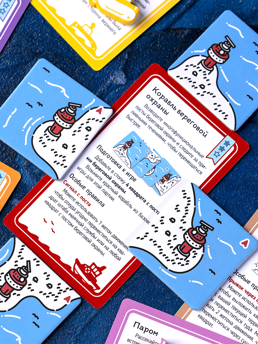 Главное новшество — семь уникальных кораблей, каждый со своей асимметричной способностью и уровнем сложности. Теперь у каждого игрока появляется личное судно, которое влияет на движение, выкладку квадратов и итоговый результат команды. Экспедиционный катер, например, меньше манёврен на воде, но позволяет выкладывать жетоны через сушу, прокладывая необычные маршруты вдоль береговой линии. Крановое судно строит ветрогенераторы, которые повышают гибкость перемещения и приносят дополнительные победные очки за освоение прибрежных ветропарков. Другие корабли — исследовательское судно, береговая охрана, воздушная подушка и строительное судно — дают эффекты вроде обмена тайлов, мгновенных перемещений к штабам и аутпостам или восстановления жетонов движения.