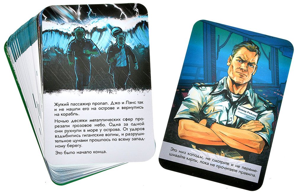 Основой служит колода из 112 карт, с помощью которых вы будете читать сцены, принимать решения и исследовать локации корабля. На картах‑сценах встречаются выделенные ключевые слова – объекты, имена, детали окружения, которые можно «проверить», отыскав соответствующую карту в общей раскладке. Если догадка верна, история продвигается вперёд, открывая новые факты, предметы или варианты действий; ошибка же может обойтись дорого и приблизить одну из неудачных развязок.