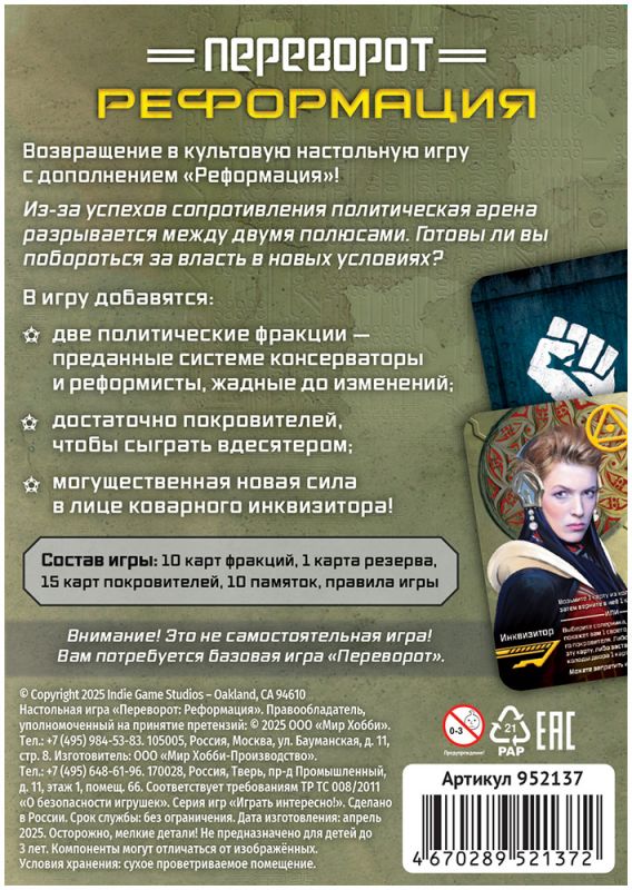 Важно: это не самостоятельная игра. Для использования дополнения требуется базовая версия «Переворот», в которой находятся основные карты персонажей, монеты, жетоны влияния и полный набор базовых ролей. «Реформация» расширяет уже знакомую колоду и добавляет новые режимы – в том числе возможность командной игры с фракциями при сохранении единоличного победителя.​