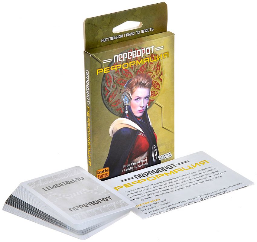 «Переворот: Реформация» – дополнение к культовой карточной игре на блеф и влияние «Переворот», которое вносит в привычный расклад новый уровень политического раскола. Из‑за успехов сопротивления город больше не единое коррумпированное болото: улицы и площади разделены агитацией двух лагерей, а игрокам приходится выбирать сторону и манипулировать уже не только личной властью, но и лояльностью к фракции.​