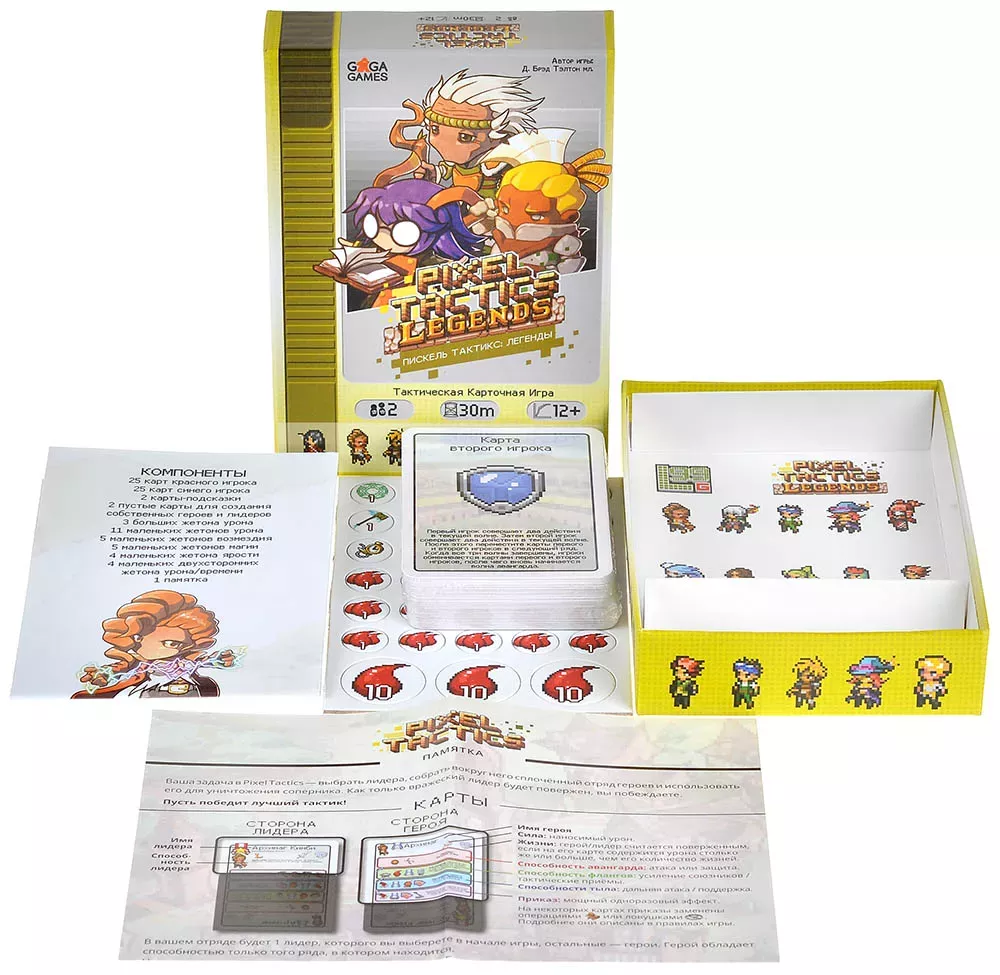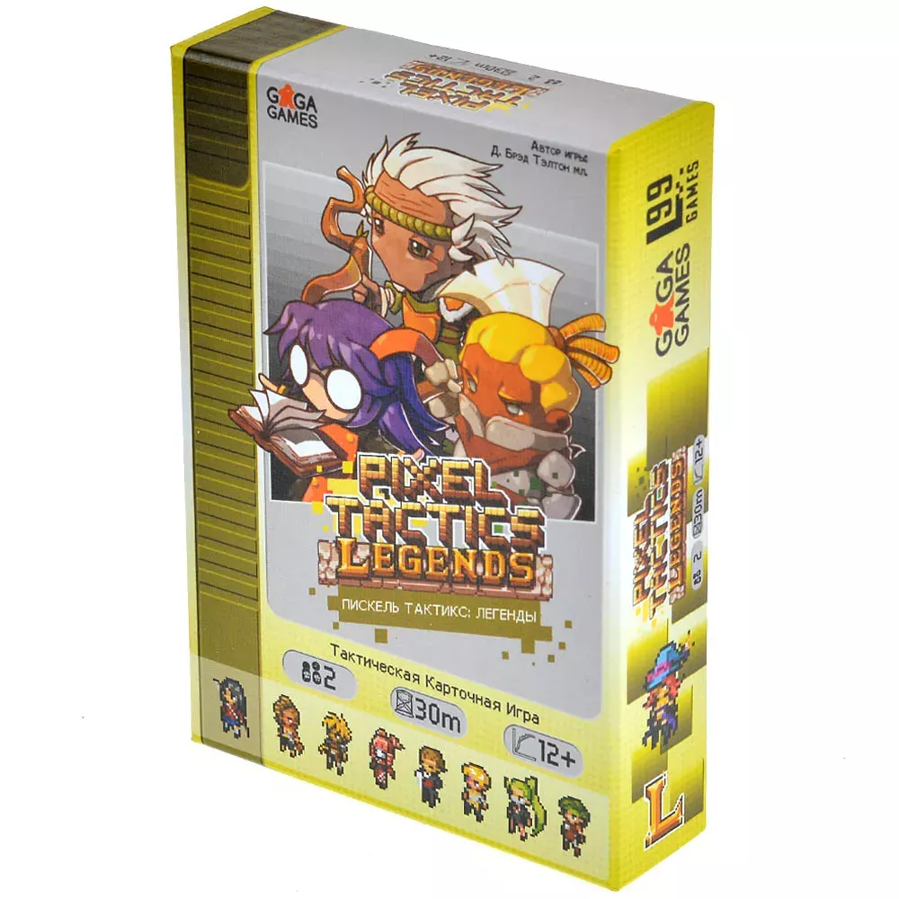 При этом по времени «Пиксель Тактикс: Легенды» остаётся довольно компактной. Средняя партия занимает около 30 минут, а за счёт симметричных колод и огромного количества лидеров (50 вариантов) реиграбельность очень высокая: каждая комбинация лидера и построение отряда ощущаются по‑новому. Коробка удобного небольшого формата, поэтому игру легко брать с собой и играть сериями дуэлей.
