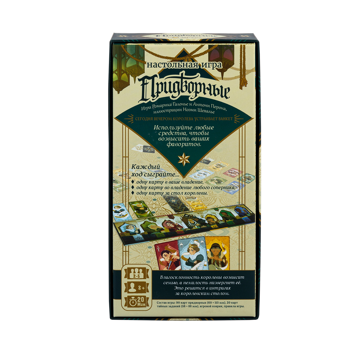 «Придворные» – динамичная карточная игра про борьбу знатных семей за влияние при королевском дворе. Сегодня вечером королева устраивает пышный банкет, и главы шести фамилий пытаются посадить своих людей на самые выгодные места. Один неверный ход – и семья окажется в немилости, а правильно разыгранный придворный может принести вам решающие победные очки в конце партии.