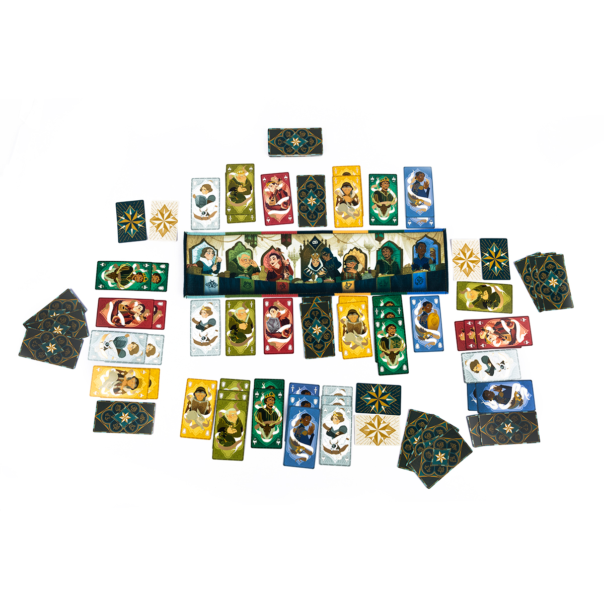 • Карты придворных шести семей – основная колода; каждая карта принадлежит семье и может давать положительные или отрицательные очки в зависимости от её статуса.