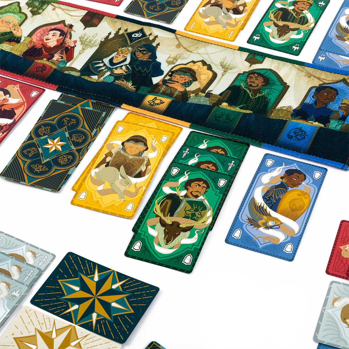 Не все придворные одинаково просты. В колоде есть особые роли с уникальными эффектами: дворянин в конце игры считается за две карты и особенно важен при определении статуса семьи. Убийца позволяет избавиться от любой карты в той области, куда он сыгран, обнуляя тщательно выстроенные планы соперников. Страж со щитом, наоборот, защищает важных придворных от покушений и помогает сохранить ключевые позиции. Шпионы скрываются под рубашкой и раскрываются только в финале, иногда полностью меняя баланс сил за столом королевы и во владениях.
