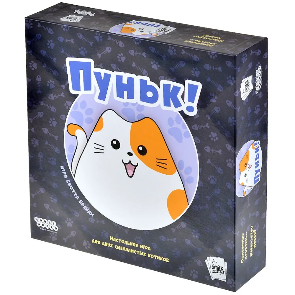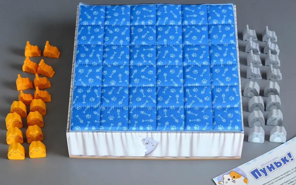 «Пуньк!» – очаровательная дуэльная настольная игра, в которой два игрока сражаются за мягкую кровать, усыпанную котятами и котами. Игровое поле оформлено в виде стёганого одеяла, а вместо привычных абстрактных фишек здесь – милые фигурки пушистых хвостатых. Ваша цель проста и забавна: первым выстроить ряд из трёх взрослых котов или разместить на одеяле всех своих котов одновременно, превратив кровать в личный кошачий трон.