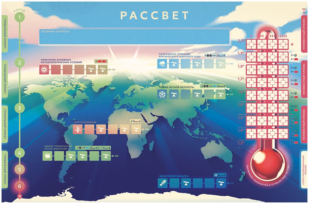 «Рассвет» — кооперативная стратегическая игра от Мэтта Ликока, создателя легендарной «Пандемии», в которой игроки объединяют усилия ведущих мировых держав, чтобы предотвратить климатическую катастрофу. Над Землёй нависла угроза глобального потепления, и только совместными действиями Китая, Европы, США или развивающихся стран можно разработать технологии, сократить выбросы углерода и справиться с кризисами вроде штормов, засух и инфраструктурных сбоев.