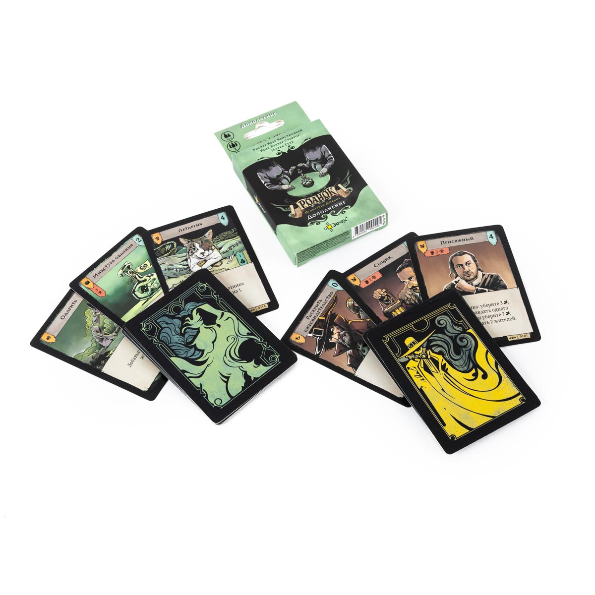 Это дополнение не вводит новые ресурсы, планшеты или сложные правила, а точечно усиливает уже существующую систему. Внутри вы найдёте набор новых карт для обеих сторон — по 16 для охотника и ведьмы. Эти карты помогают по‑новому раскрыть знакомые механики базового «Роанока»: добавляют неожиданные комбинации, меняют темп игры и позволяют строить более гибкие или агрессивные колоды под ваш стиль.