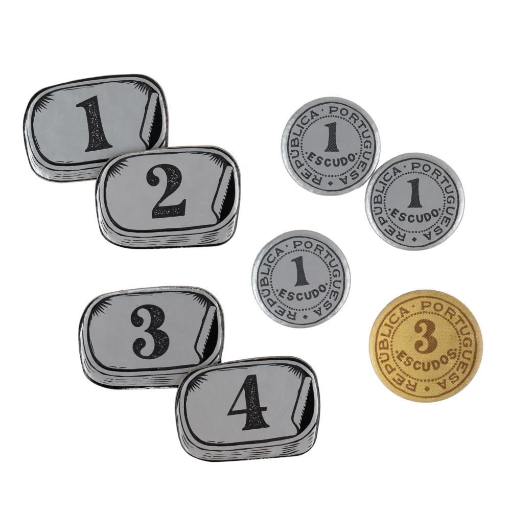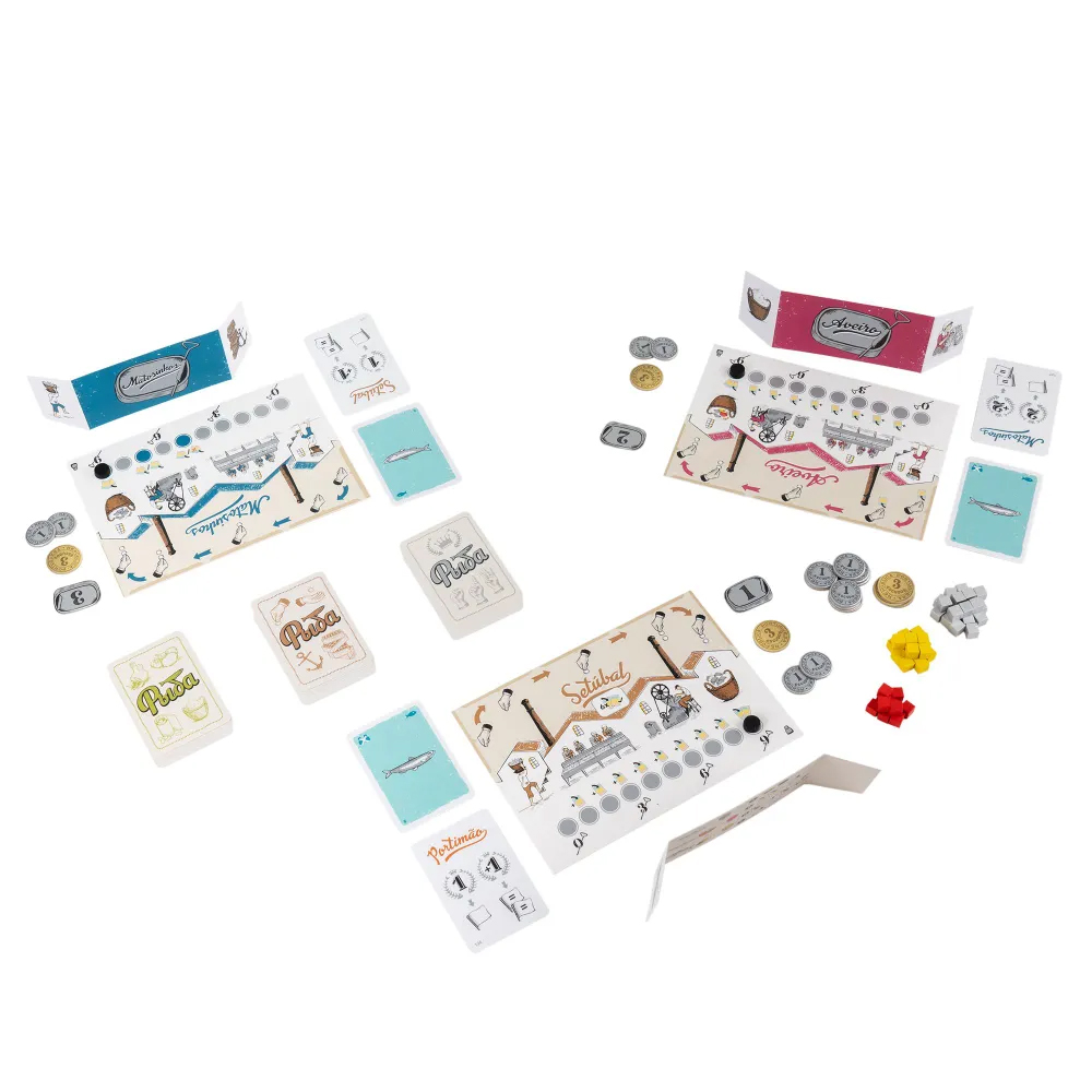 При этом игра выглядит очень стильно и точно порадует настольных эстетов своим оформлением и качеством компонентов. Тут и поп-арт старых рекламных афиш, и лёгкий примитивизм, и игривые линии скетчинга, и леттеринг в стиле росписи вывесок магазинов начала XX-го века. Все цвета приглушённые, неброские, а все серые элементы и вовсе напечатаны согласно цветовой модели Pantone — и буквально сияют, напоминая одновременно и о рыбьей чешуе, и о консервных банках, и о манящем серебре эскудо — португальской валюты, которую позднее сменило евро.