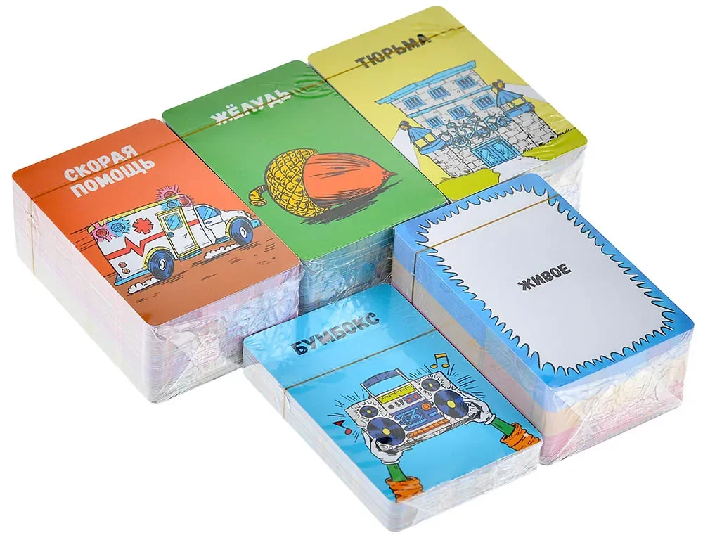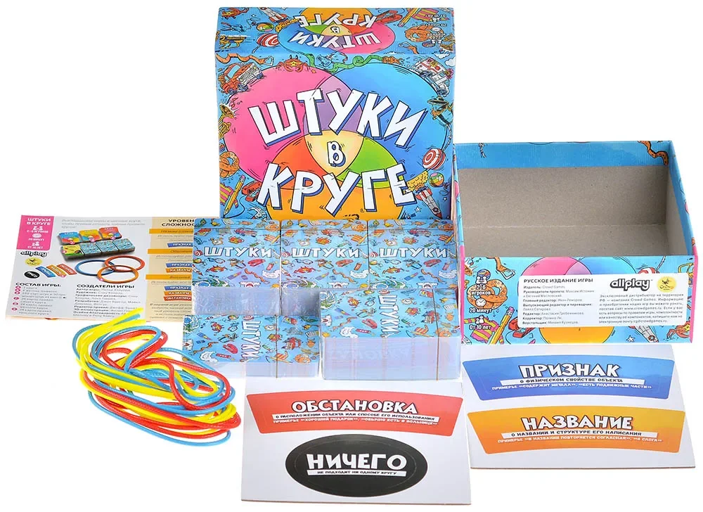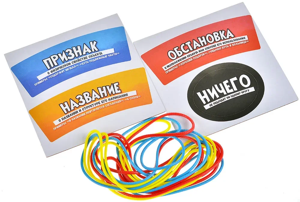 • 240 карт штук — основные изображения предметов/ситуаций, которые игроки выкладывают в круги.