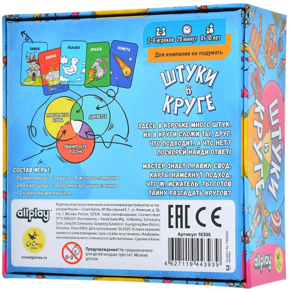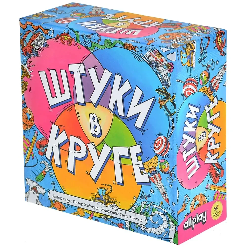 «Штуки в круге» — весёлая пати‑игра с дедукцией, в которой участники пытаются разгадать скрытые правила трёх пересекающихся кругов. В центре стола лежат цветные круги, образующие диаграмму Эйлера, а вокруг — игроки с картами «штук»: забавными предметами, существами и ситуациями. Каждому кругу соответствует секретное правило, которое знает только ведущий, и задача остальных — по косвенным подсказкам понять, что именно означают эти зоны.​