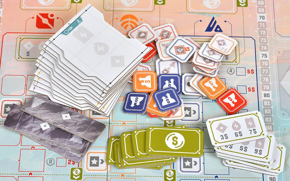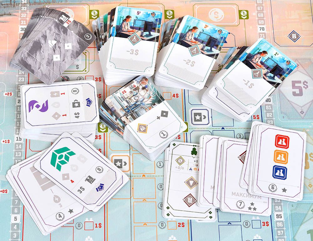 На общем поле располагаются: рынок участков, треки стоимости трёх компаний, слоты для общих целей и несколько рядов карт. В открытой выкладке доступны усовершенствования, контракты и карты денег с печатными действиями на обратной стороне. В конце раунда ряды частично обновляются, поэтому окно возможностей постоянно смещается, а доступ к нужным картам становится предметом борьбы между игроками.
