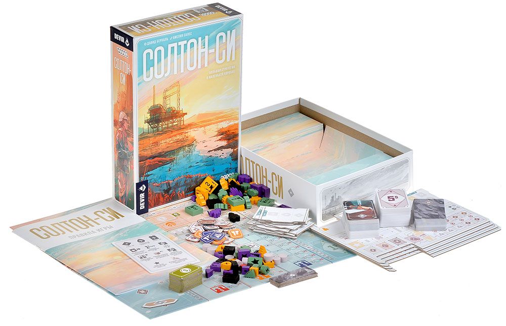 Компонентно «Солтон-Си» заметно выделяется для игры такой глубины благодаря относительно компактной коробке. Внутри при этом скрывается более двухсот карт разных форматов, несколько десятков жетонов и фишек, крупное поле и планшеты компаний, что создаёт ощущение «большой евроигры в маленькой коробке». Отдельно подчёркивается важность протекторов: в игре используется 214 карт формата 44 × 67 мм и 4 крупных карты 79 × 120 мм, которые активно тасуются и берутся в руку.