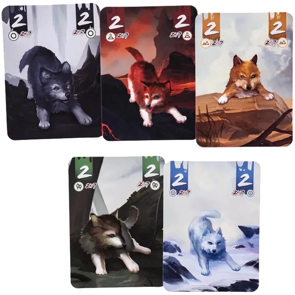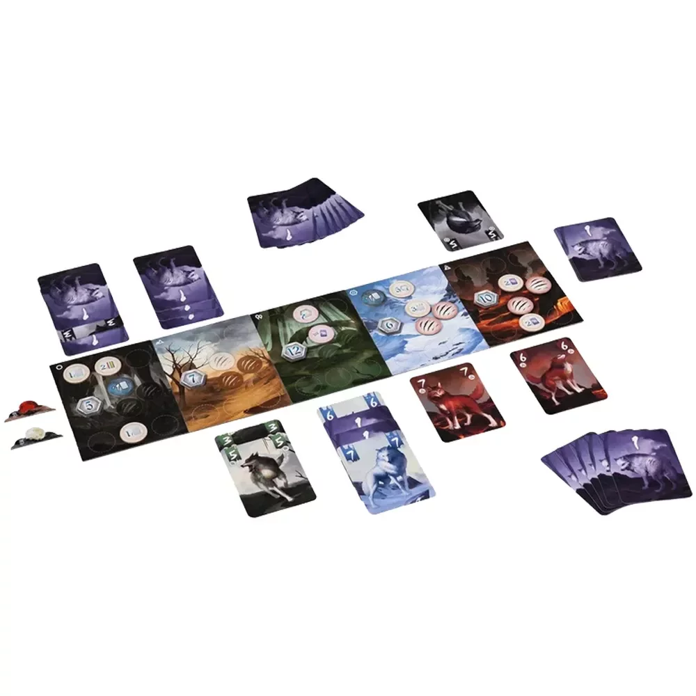 В центре стола лежит узкое поле, разделённое на пять вертикальных территорий: пещера, вулкан, пустыня, болото и тундра, каждая со своим цветом. Эти территории одновременно выступают и мастями карт, и «лейнами» для борьбы. В колоде 30 карт волков – по одной карте значений 2–7 в каждой из пяти мастей. В начале партии каждый игрок получает по 13 карт, а 4 карты остаются неизвестными, создавая лёгкую неопределённость в подсчётах.