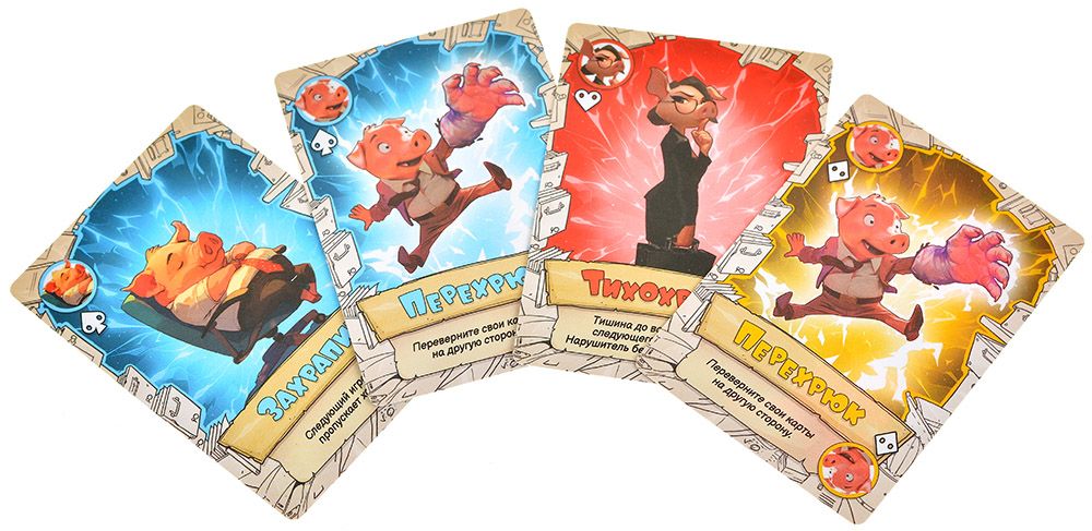 Специальные карты (например, «Перехрюк», «Полисвин», «Тихохрюн» и др.) добавляют особые условия: переворот рук, смену цвета, ограничения на разговоры за столом и дополнительные штрафы за ошибки.