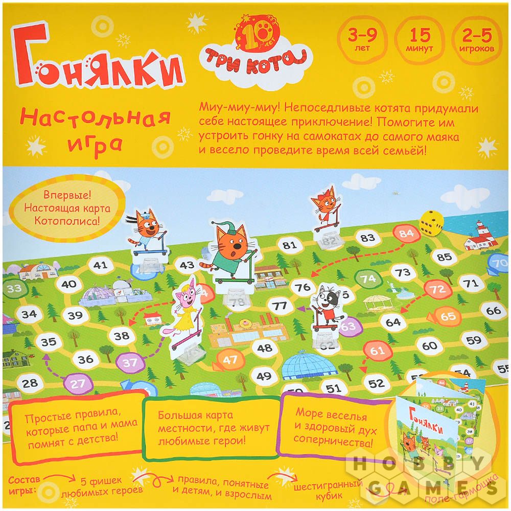 «Три кота: Гонялки» — простая и яркая детская настольная игра‑гонка по мотивам популярного мультсериала о котятах Коржике, Компоте и Карамельке. Игроки отправляются в весёлое путешествие от домика до маяка, соревнуясь, чей котёнок доберётся до моря первым, а по пути используют специальные клетки‑«гонялки», чтобы обгонять соперников и устраивать забавные манёвры.