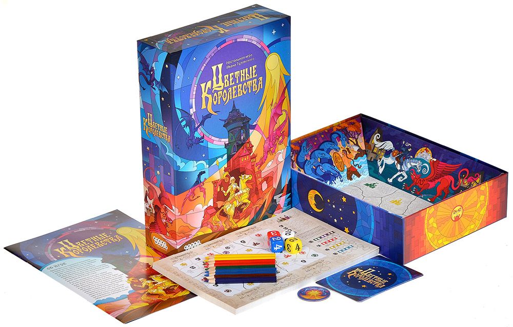«Цветные королевства» – семейная настольная игра‑раскраска, в которой вам предстоит вернуть утраченную магию сказочному миру, погрузившемуся в чернильную тьму. Краски королевств потускнели, в глуши поселились чудовища, но на небе появляется яркая комета, и её разноцветные капли падают на карту, даря шанс раскрасить земли заново и вернуть им былую славу. Игроки становятся волшебниками‑покровителями и с помощью цветной магии выгоняют тьму, прогоняют или приручают чудовищ и наполняют мир сочными оттенками.