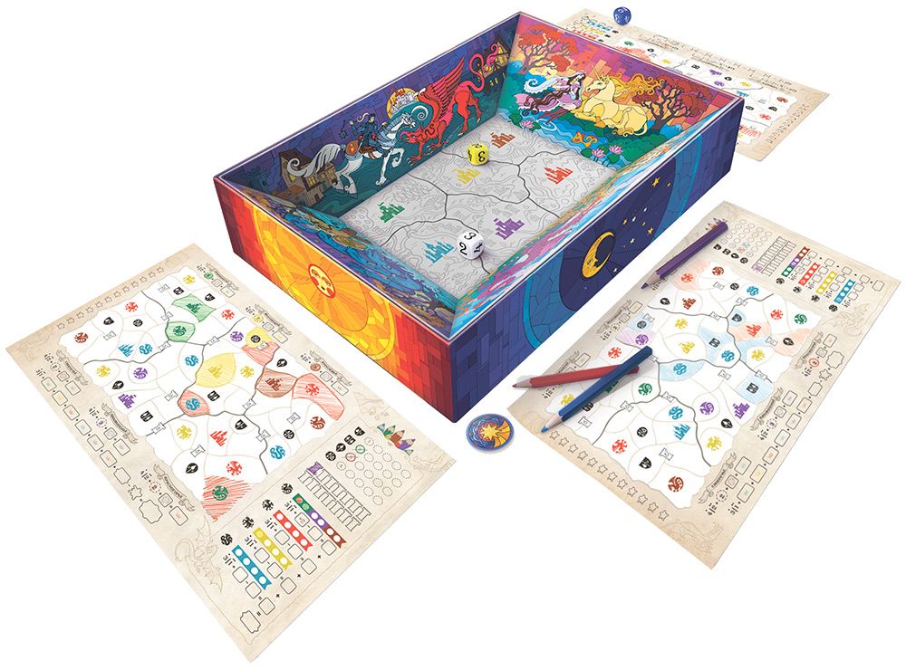 На листах игроков изображены несколько королевств с различными зонами, чудовищами, столицами, башнями и особыми ячейками. Закрашивая области базовыми цветами – красным, жёлтым и синим, – вы не только зарабатываете победные очки, но и получаете доступ к заклинаниям, бонусам и взаимодействиям с чудовищами. В особых местах, например у сторожевых башен, можно смешивать базовые цвета и создавать составные – фиолетовый, зелёный и коричневый – которые открывают ещё более выгодные комбинации и приносят дополнительные очки.