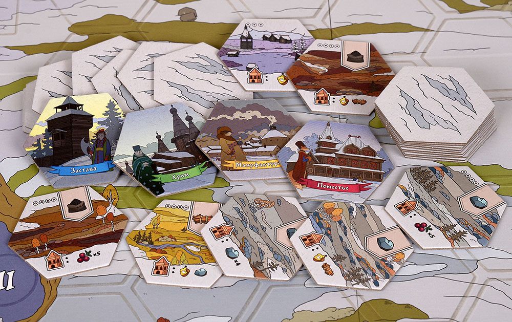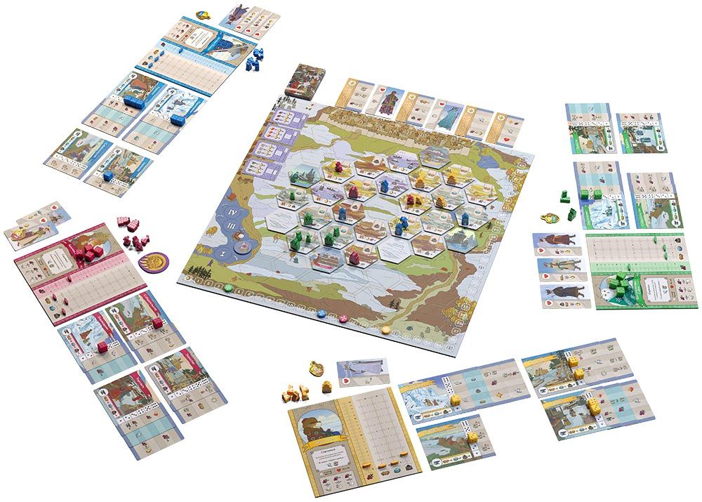 Игровое поле Тундры составляется из шестиугольников: в начале открыты только стартовые гексы игроков и несколько соседних, а остальное предстоит исследовать в ходе партии. В распоряжении каждого – планшет персонажа с особым свойством и треками ресурсов, а также четыре планшета приказов: зодчество, собирательство, перемещение и торговля. Именно на эти планшеты вы будете отправлять кубики-рабочих, чтобы строить здания, добывать ресурсы, осваивать новые земли и торговать, постепенно превращая суровую Тундру в процветающее владение.​