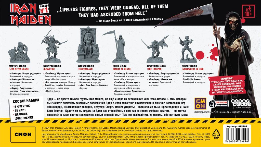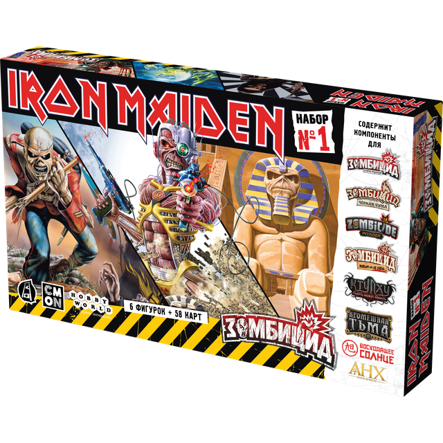 «Зомбицид: Iron Maiden. Набор №1» — тематическое дополнение, созданное для поклонников хеви‑метала и настольных игр одновременно. В центре набора стоит легендарный Эдди — узнаваемый маскот группы Iron Maiden, который десятилетиями украшает обложки альбомов и постеры, а теперь получает собственное настольное воплощение. С этим набором Эдди становится полноценным персонажем в ваших партиях, причём не только в «Зомбициде», но и в других известных играх студии CMON. Дополнение превращает каждую сессию в своеобразный кроссовер между миром настолок и атмосферой классического металла.