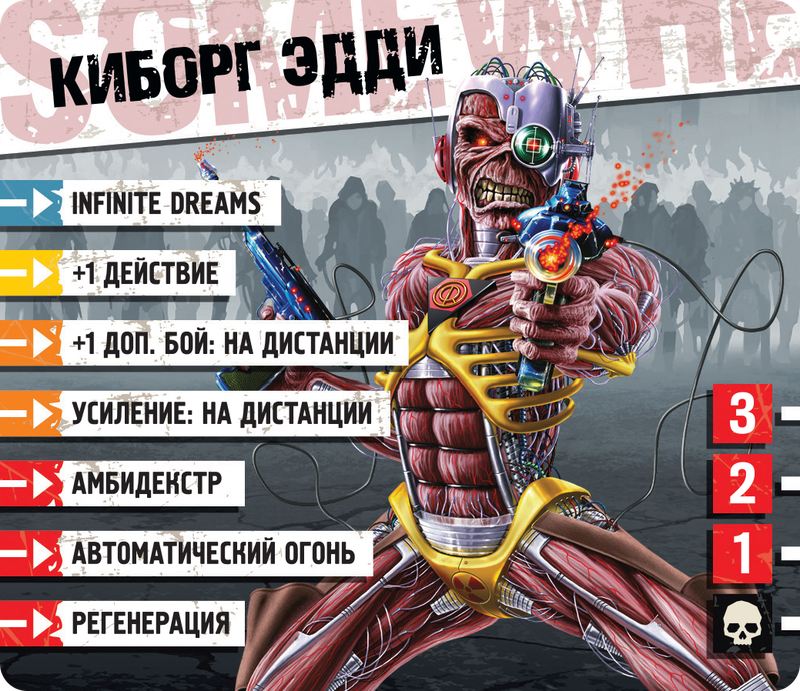 Атмосферно «Зомбицид: Iron Maiden. Набор №1» создаёт эффект живого концерта в мире настолок. Эдди — персонаж яркий, провокационный и запоминающийся, и его присутствие в партиях усиливает ощущение драйва и безумия происходящего. Независимо от того, сражаетесь ли вы с ордами зомби, древними божествами, мифическими чудищами или противниками в стратегических баталиях, участие Эдди делает каждую историю более необычной. Это дополнение особенно оценят компании, где есть фанаты Iron Maiden и игроков, уже знакомых с серией Зомбицид и другими проектами CMON.