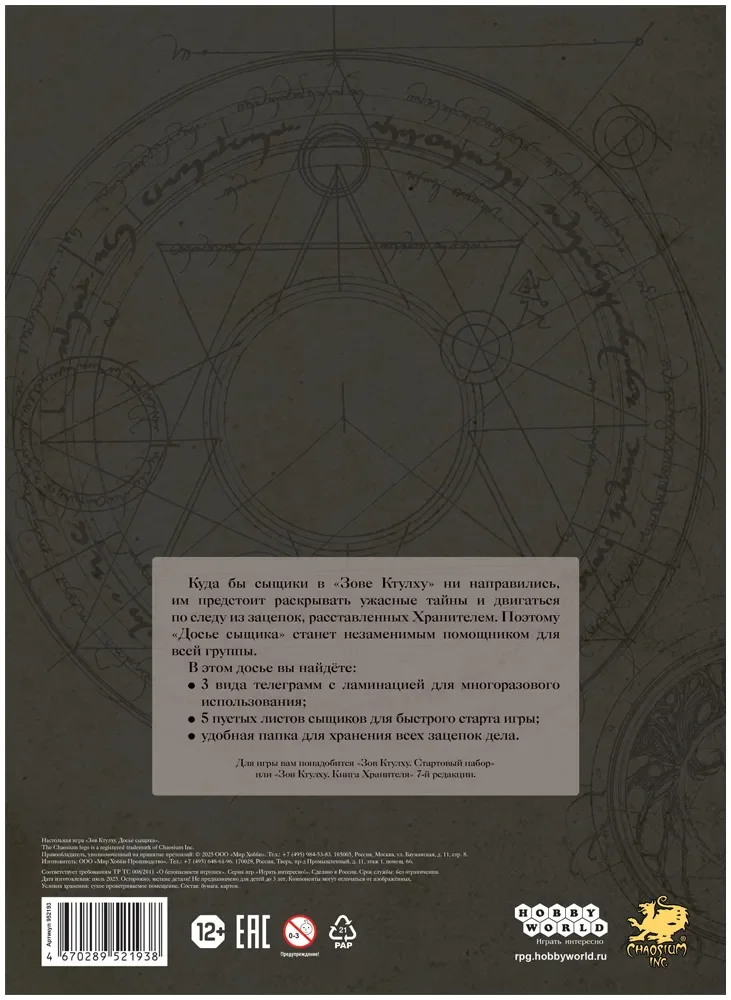 Набор отлично сочетается с книгами «Зов Ктулху. Книга сыщика» и «Зов Ктулху: Набор Хранителя», помогая создать на столе полноценный комплекс материалов — от ширмы ведущего до аккуратно оформленных личных дел всех персонажей. Если вы хотите подчеркнуть атмосферу расследования, придать игре визуальную «тяжесть» и упростить работу с документами, «Досье сыщика» станет практичным и стильным дополнением к вашей ролевой кампании.